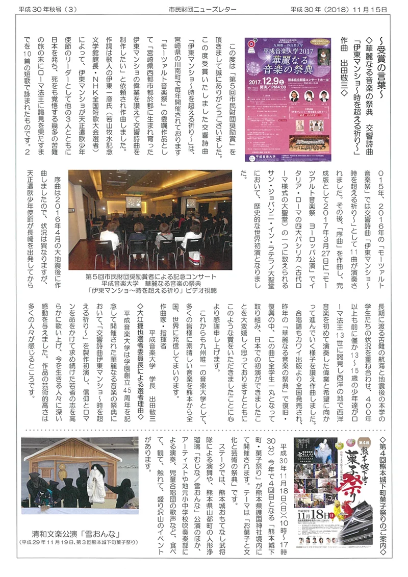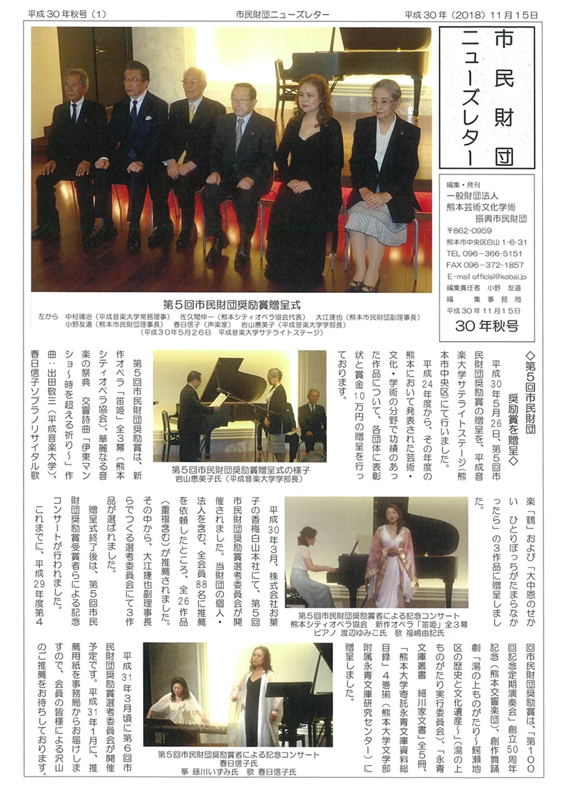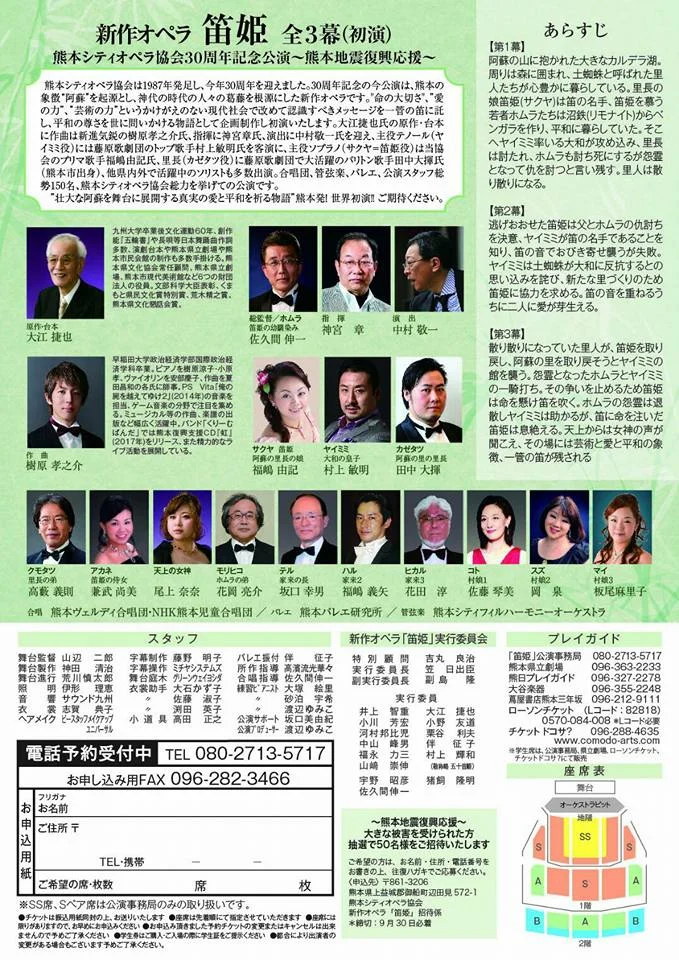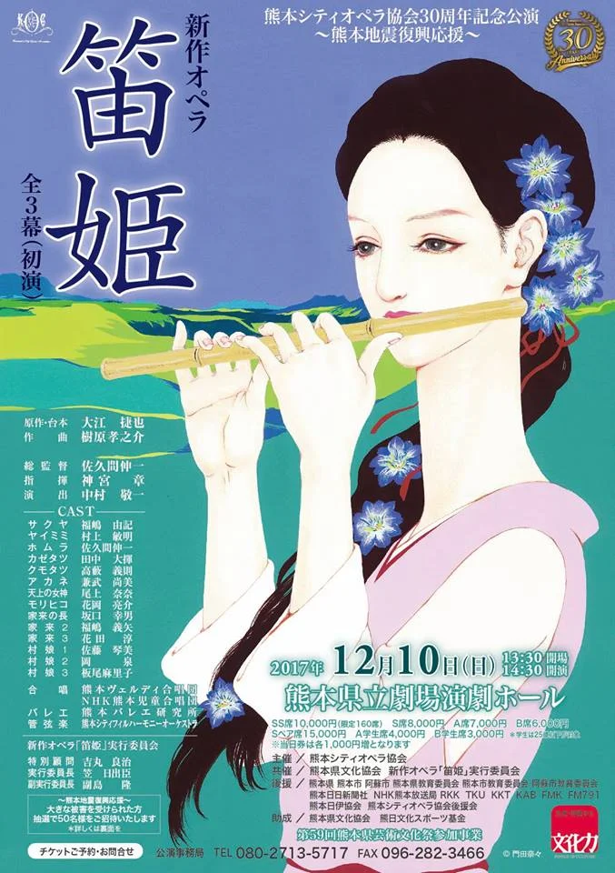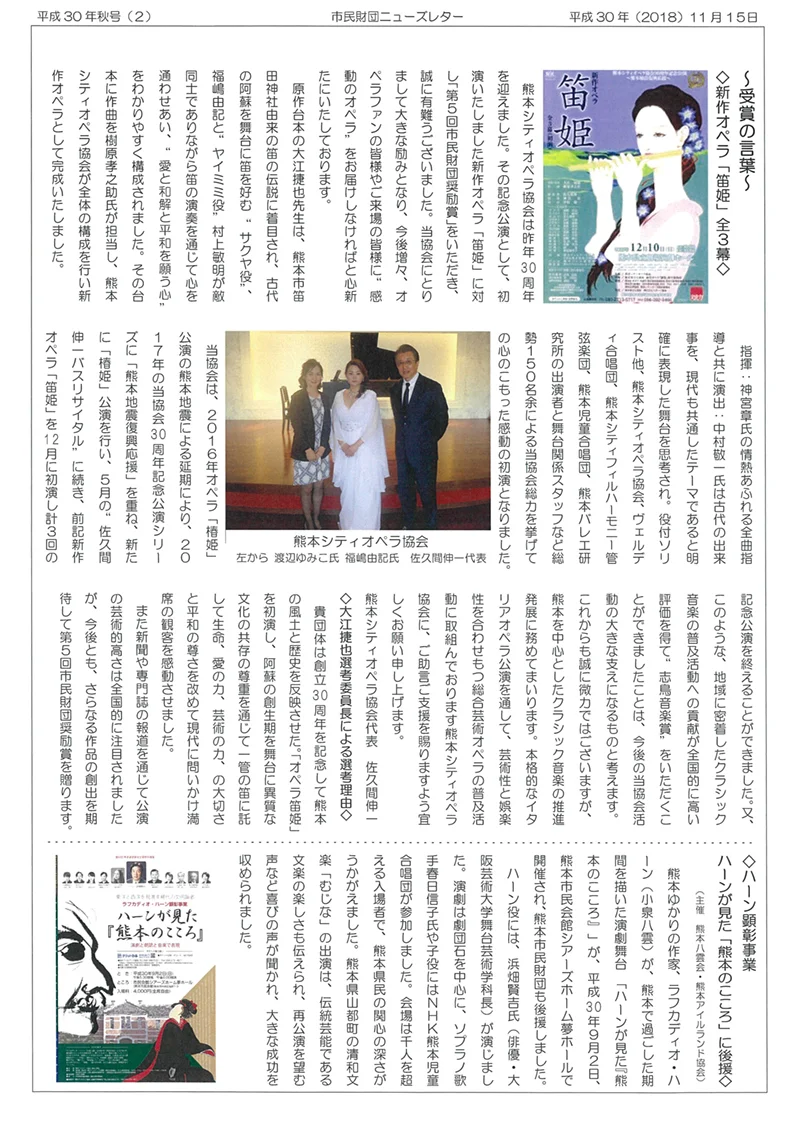 貴団体は創立三十周年を記念して熊本の風土と歴史を反映させた。「オペラ笛姫」を初演し、阿蘇の創生期を舞台に異質な文化の共存の尊重を通じて一管の笛に託して生命、愛の力、芸術の力、の大切さと平和の尊さを改めて現代に問いかけ満席の観客を感動させました。