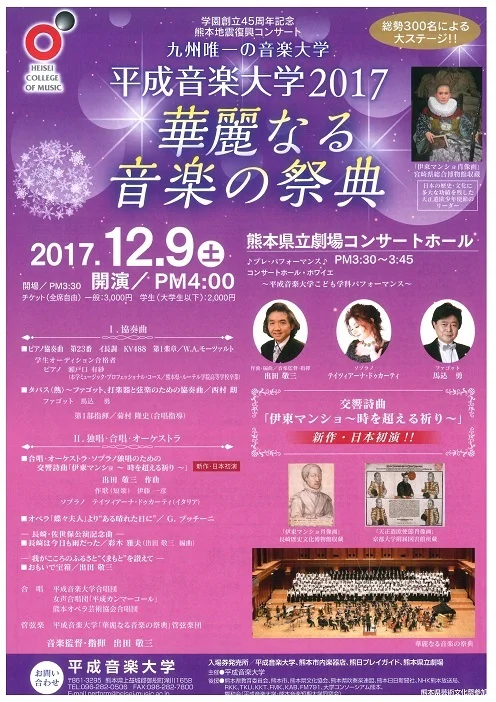 貴大学は学園創立四十五周年を記念して開催された華麗なる音楽の祭典において、「交響詩曲伊東マンショ~時を超える祈り~」を製作初演し、信仰とロマンを命をかけて求め続けた若者の志を高らかに歌い上げ、今を生きる人々に深い感動を与えました。