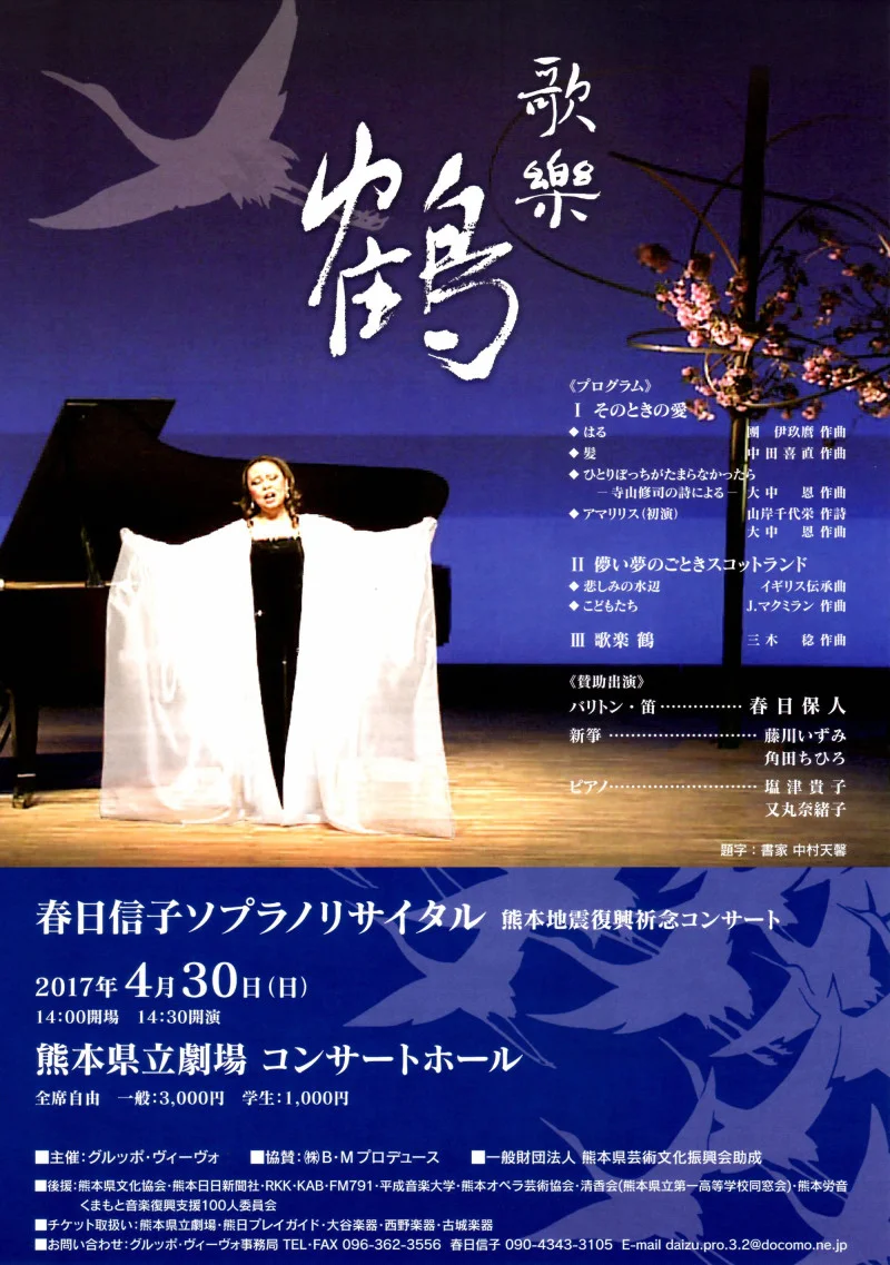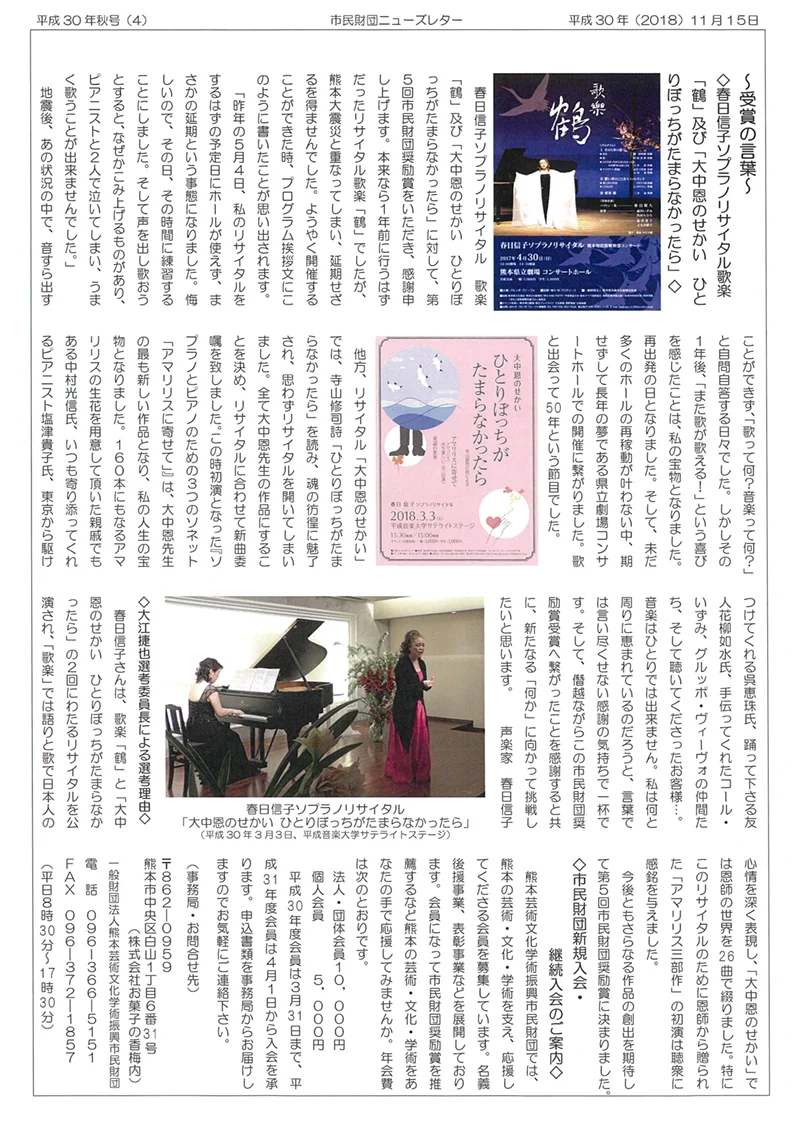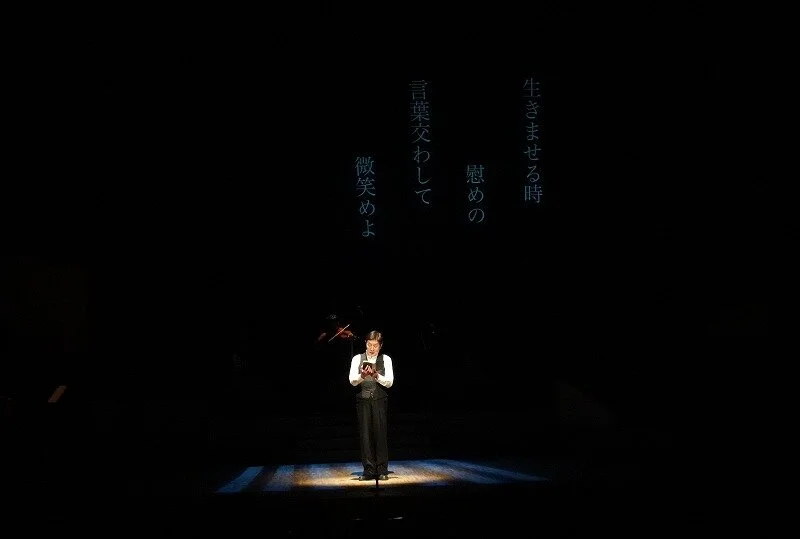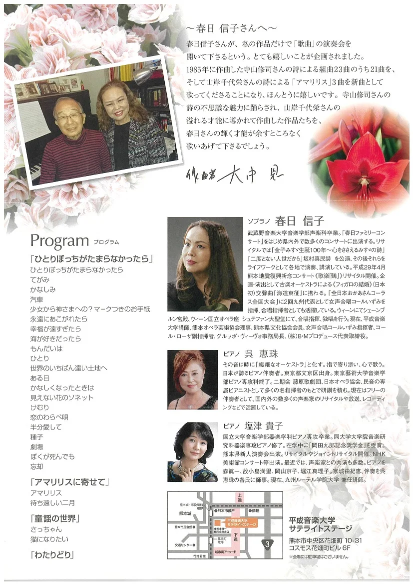 歌楽「鶴」と「大中恩のせかい ひとりぼっちがたまらなかったら」の二回にわたるリサイタルを公演され、「歌楽」では語りと歌で日本人の心情を深く表現し、「大中恩のせかい」では恩師の世界を二十六曲で綴りました。特にこのリサイタルのために恩師から贈られた「アマリリス三部作」の初演は聴衆に感銘を与えました。
