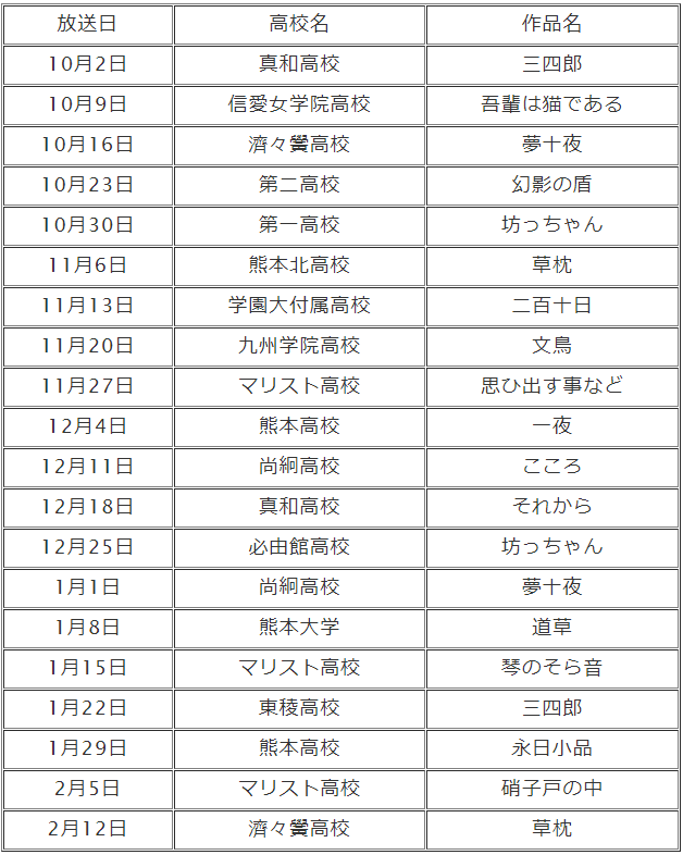 夏目漱石が熊本の地に降り立って150年余。漱石の作品は今も私たちに深い感動を伝えてくれます。この度の熊本県内の高校生らが夏目漱石の作品を率直に語り合った御社制作のラジオ番組「『アイラヴ漱石先生』朗読館」は、夏目漱石の作品について理解を深めたい、漱石について詳しく知りたいという欲求に応え、現代の若者たちに漱石を身近に感じられた素晴らしい企画でした。生徒たちの等身大の言葉で語られる内容は、私たちに感動を与えました。このような取り組みの継続と今後益々の活動に期待します。